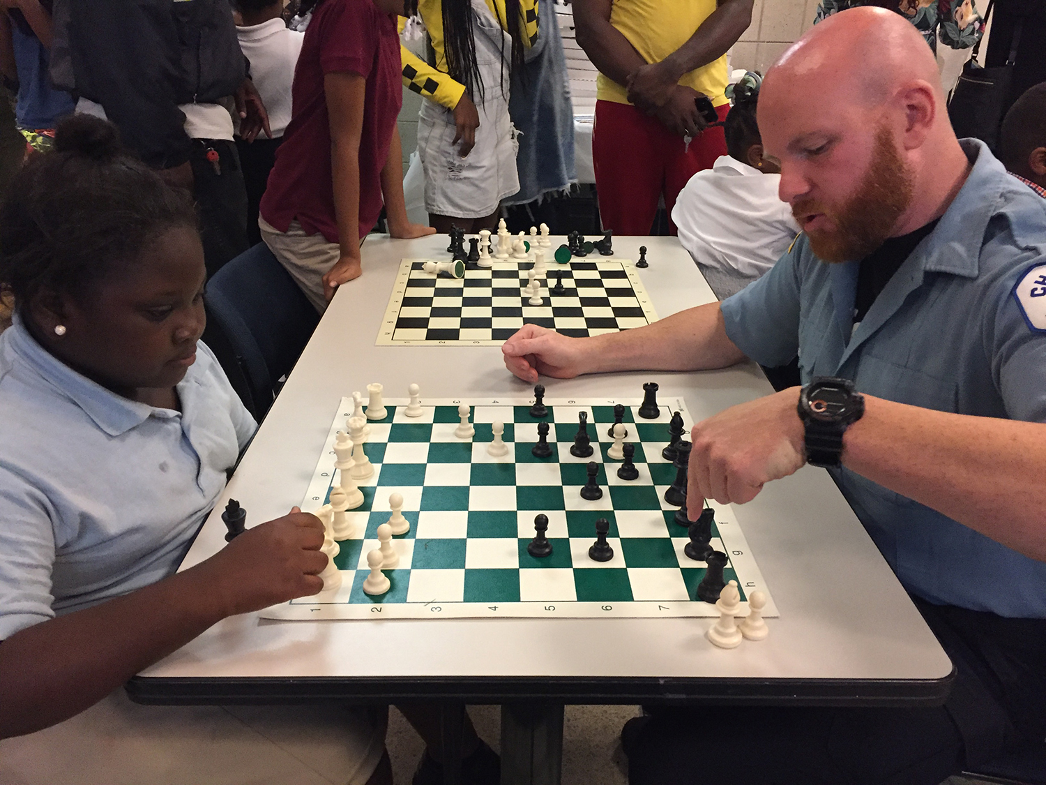 Officer Cortez Cox said he’s sharpened his skills playing chess at the events. “It was a blessing to see all the kids and the adults. Everybody can learn, [even] people who’ve never played before. And they have professionals who can help you; there are some people here who have played 20 or 30 years.”