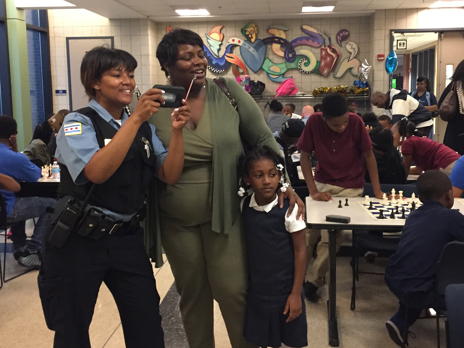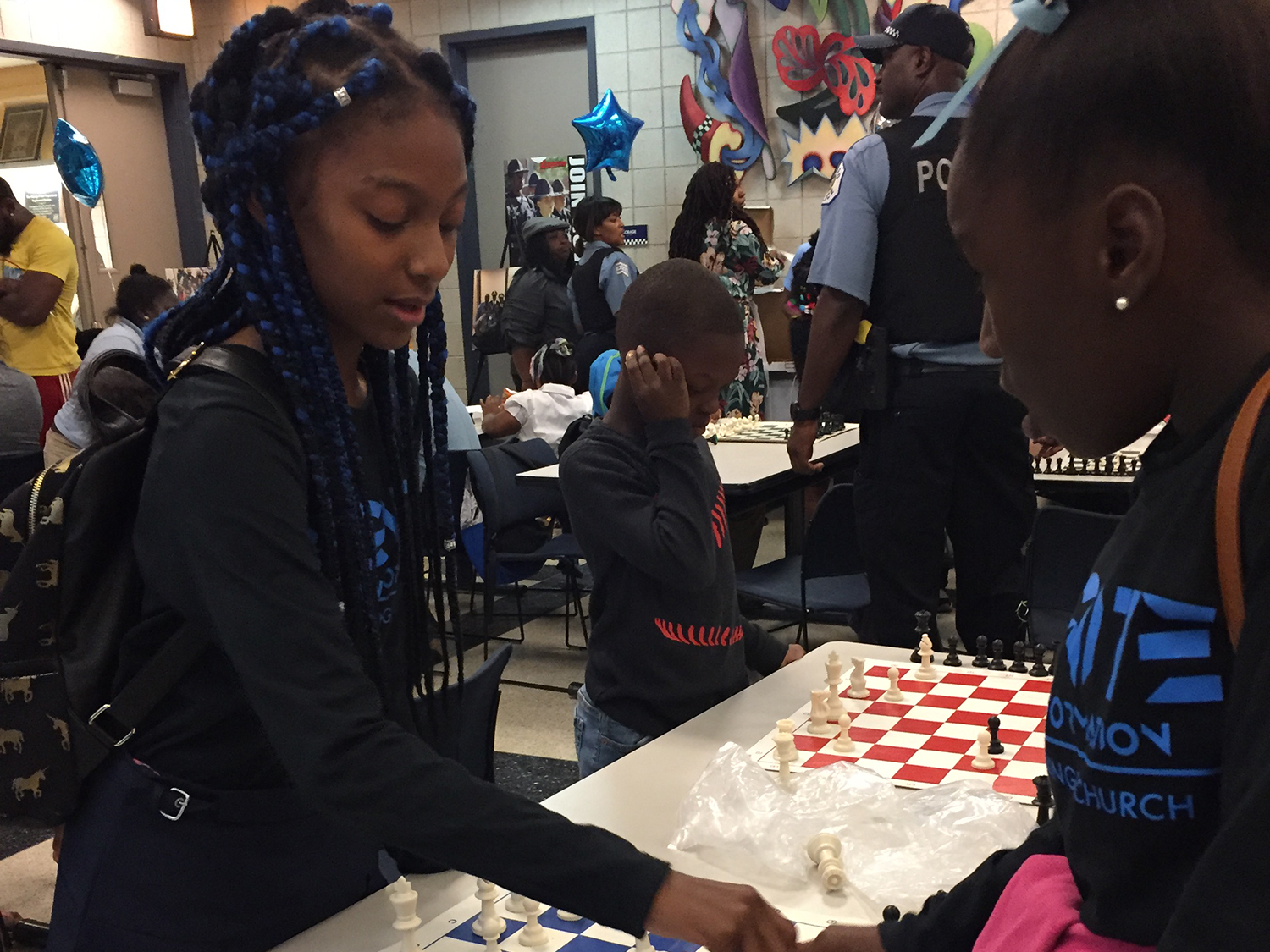 Terriah is among the youth who participate in Not Before My Parents (NBMP) Chess Moves Against Violence: Bridging the Gap with CAPS. An expansion of the NBMP chess club, Bridging the Gap with CAPS aims to use chess as a way to help youth to consider potential outcomes of their daily choices, bringing community members and police together at the Englewood District police station for both chess lessons and matches.